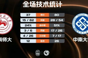 巨大的分差也让中南大学完全掌控局势,杜怡和陈静娴依旧稳定拿分帮助球队不断扩大领先,湖南师大则依旧被动完全制造不了任何威胁,这一节中南大学再胜12分,最终,中南大学以80-37大胜湖南师范大学杀入决赛。